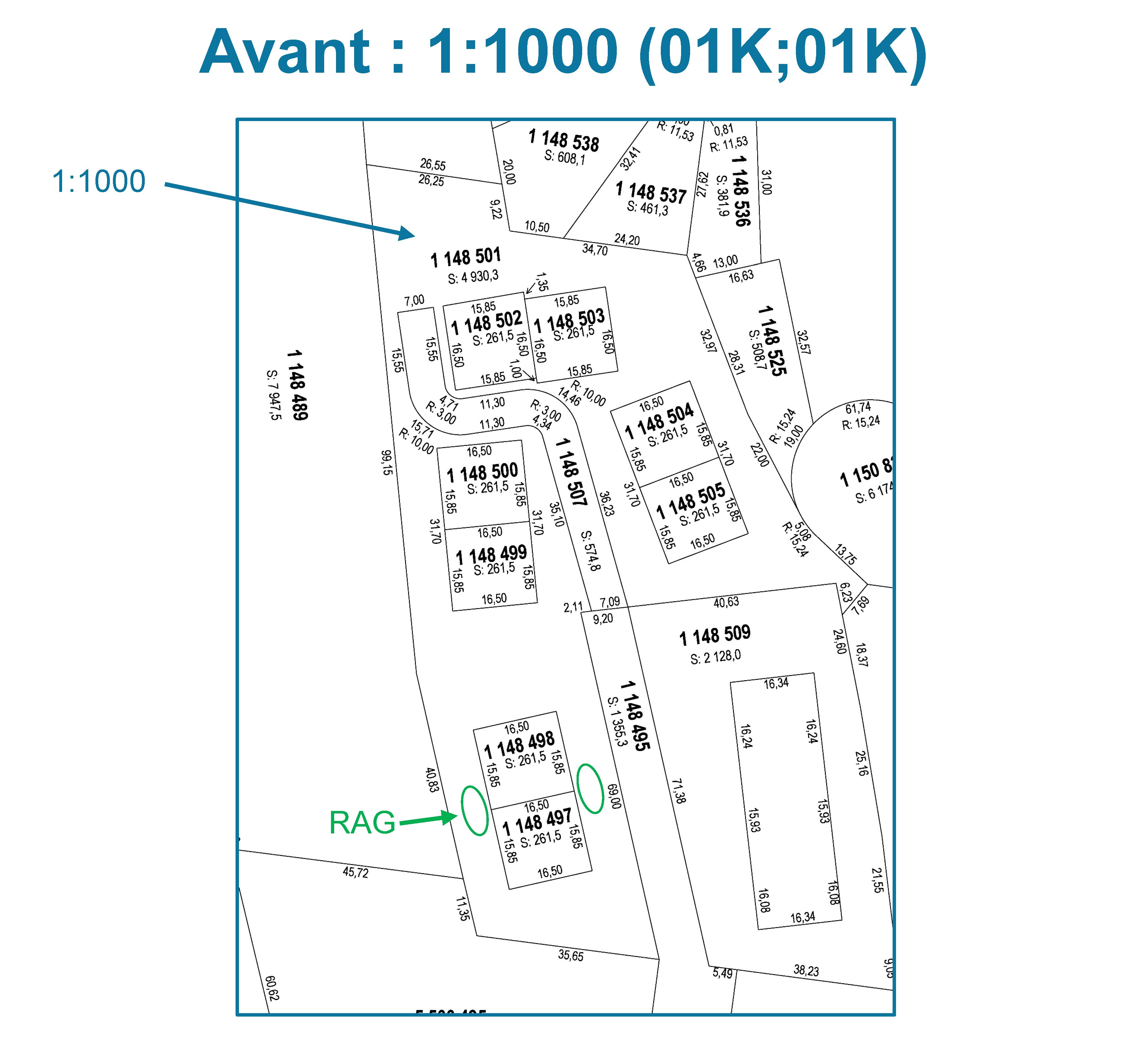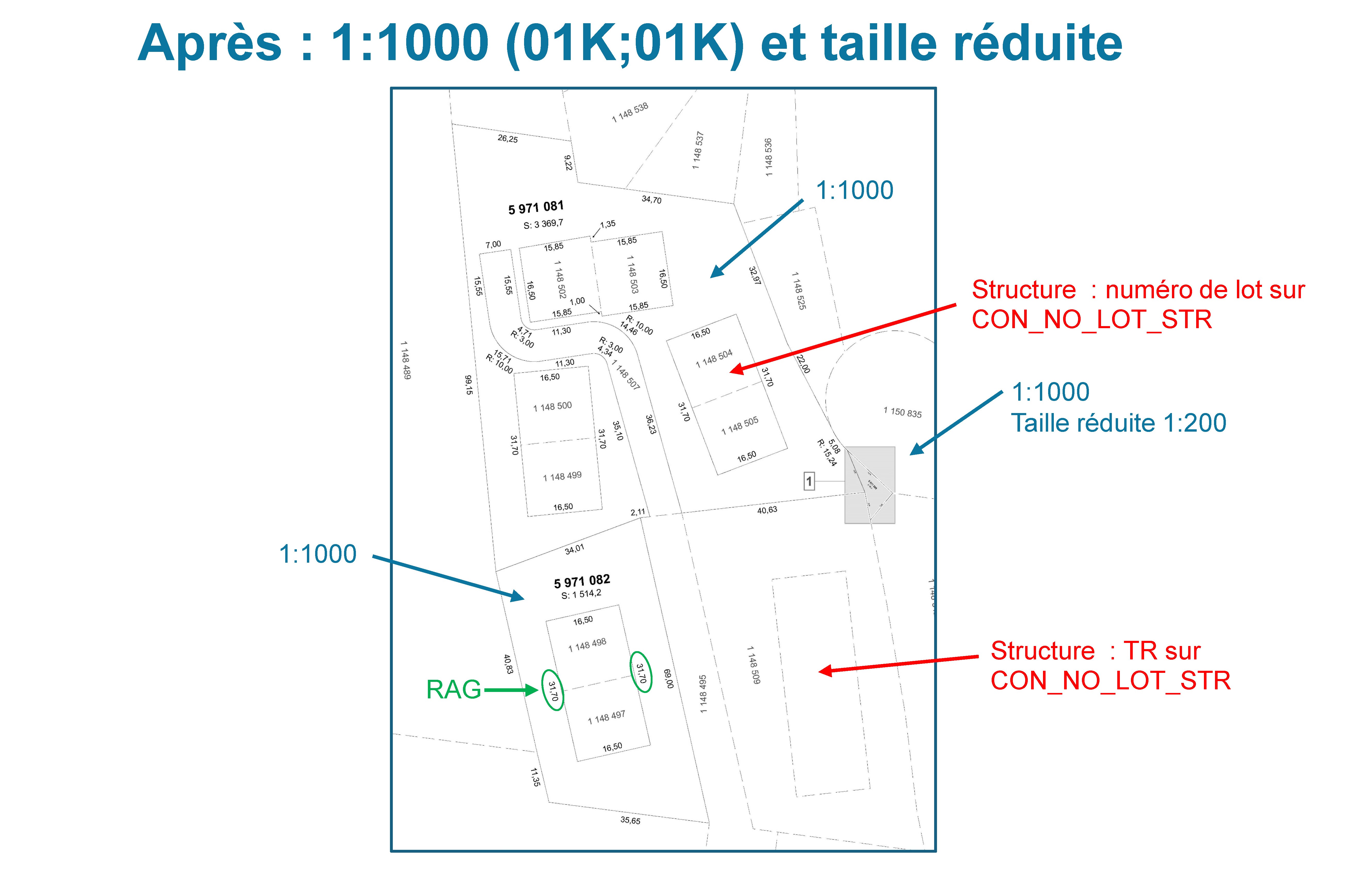 - Exemple : un dossier créé 2 lots à 1 :5000 (02K;05K) dont un petit lot montré entièrement en taille réduite à 1 :1000 (02K;05K). Il serait préférable de faire un changement d’échelle, c’est-à-dire garder les annotations de couleur et de taille 7, mais de corriger le document joint pour inscrire 01K;01K pour le petit lot.